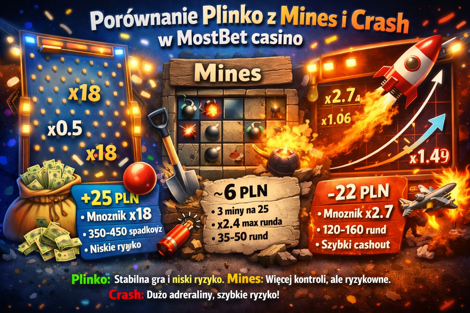 Porównanie gra Plinko z Mines i Crash w Most Bet casino
